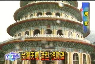 【黃惠蜜 報導】 觀眾朋友有沒有觀察到,台灣有些廟外型遠遠看有點像「飛碟」! 有些「飛碟迷」甚至猜測,大家祭拜的神明根本就是外星人!帶您 看看這些飛碟造型的廟。 這是位在淡水的「無極天元宮」,外型看來很眼熟,它和「北京天 壇」有幾分神似!五層樓高200尺、圓型直徑108尺、歷時6年才完 工。中華UFO科學學會理事長江晃榮:「當初不是按照一般建築的 程序,它是先接到天上的訊息,說要蓋這樣一個天壇,然後就在紙 上、好像是小學生畫美術畫了一個造型,然後再去請建築師根據這 樣的造型,假設要蓋的話,到底柱子要用多大?鋼筋要用多大?水 泥要灌多少?是倒過來然後是考這些建築設計的人。」 「天壇」正是古代皇上祭天的處所,也就是最接近上天的地方,傳 說可以上達天聽,如此說來,被選上打造天壇的地點、勢必靈氣逼 人,最近有些民眾上山前來活動、活動,據說不僅對身體好、病痛 也痊癒得特別快! 天元宮不僅是主體建築物和飛碟相似!觀眾朋友、您見到這宮廟後 方所謂的發跡地,恐怕會更驚訝吧!這亭樓不論是造型和顏色,和 一般人認知的飛碟真的很相像啊! 拿香祝禱、口中唸唸有詞;王先生自稱可以收到來自上天的訊息。 再環顧一下四周環境,和外星人有關聯的可不只是建築物而已,園 藝造景還別有風情!像不像是剪刀手愛德華的新作呢? |