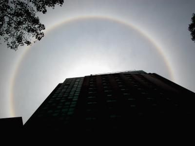 【大紀元4月28日訊】2004年4月28日上午11時45分,位于南昌市陽 明路江西日報報業大廈上空惊現了一個巨大的彩色光環,并環繞太 陽持續了近45分鐘。 据專家介紹,由于太陽光照射到含有冰晶的云層后,經過反射即出 現所謂的“日暈”現象,不過在晴空万里的南昌出現此天象實屬罕 見。