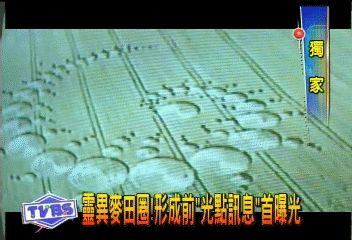 記者:陳心怡 李國正 報導 您看過電影「靈異象限」嗎?在一大片麥田中出現巨大的幾何符號 ,究竟是不是外星人的傑作?目前世界上發現最大的麥田圈是在英 國,總共有409個奇怪的圈圈,面積有6萬5千平方公尺!透過TVBS 獨家畫面,您可以看到在麥田圈形成前會有一個神秘光影,疑似在 做測量的動作這個「神秘光影」,到底是什麼?TVBS的獨家報導! 蠍子型、千變萬化的幾何圖形,一大片麥田上被烙上印記,「麥田 圈」現象,從1980年被首次發現後,至今還是一個沒辦法解開的謎 !為了追根究底,英國媒體在事發地,架設起攝影機,意外捕捉到 奇怪光影,TVBS帶您獨家一窺究竟。 台灣飛碟學會理事長黃朝明:「這個東西在上面飄過去,在這裡, 這個東西飄過去,這個光球就是在麥田圈形成的幾個禮拜前,會出 現在麥田上面,好像在測量什麼東西。」 麥田圈現象,成了電影「靈異象限」的劇本,究竟這一個個面積超 過5百平方英尺的巨型神秘圖騰,背後到底隱藏什麼秘密?台灣飛 碟學會理事長黃朝明:「一個就是外星人的航行器,幽浮飛碟降落 造成的一個痕跡,另外還有一部分人的說法就是外星人,他們要攻 擊地球的一個訊息。」 目前,像這樣的麥田圈在歐洲已經有上千個,亞洲在日本也出現過 ,最近的一個就是畫面上,在2001年出現在英國,總共有409個圓 圈,總面積6萬5千平方公尺,是現今最大的麥田圈,光是從邊緣到 最中間,就要走上30分鐘,一個個印記,人類希望靠智慧、科技解 出謎底,不過,在此之前,可能也只能把這一切當作是上帝的藝術 品。 |